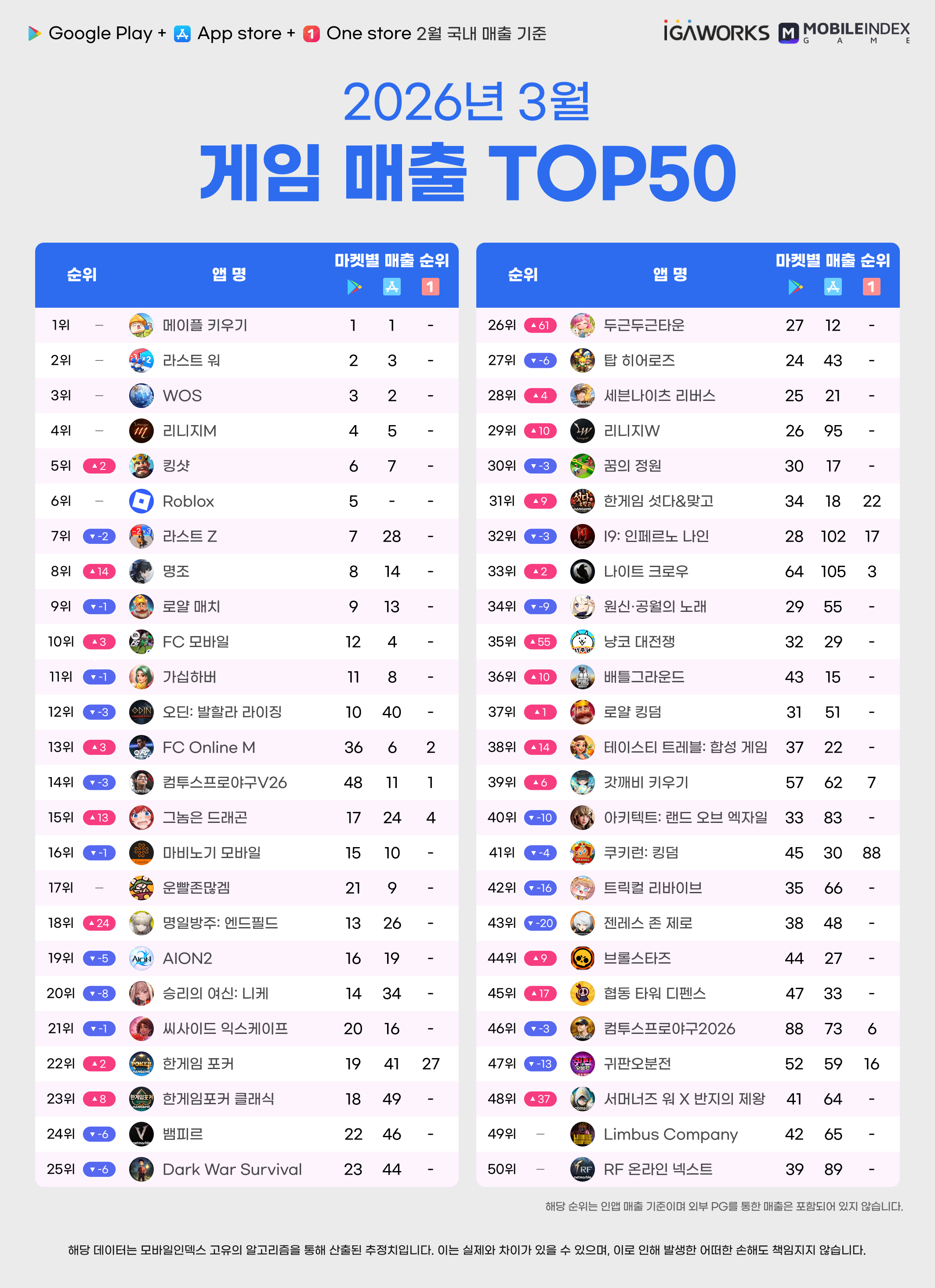 [모바일 게임 매출 순위 TOP50]