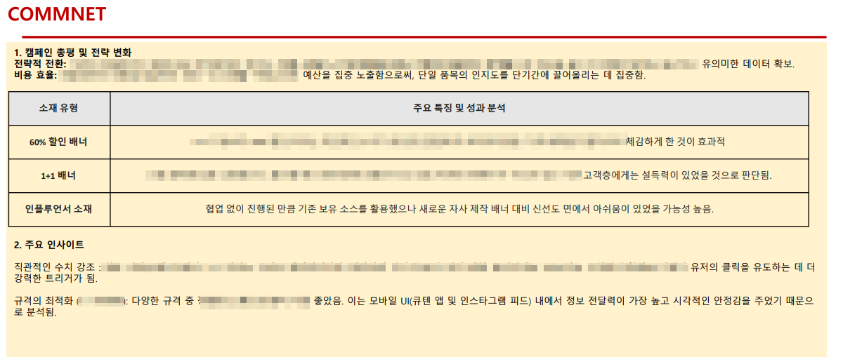 이 지점에서 제품별 역할 분리도 중요해집니다. 크림이 검색보다는 배너에서 더 강했다는 분석은, 모든 제품을 같은 방식으로 광고하는 것이 아니라 제품마다 잘 맞는 채널을 달리 가져가야 한다는 점을 시사합니다. 문제 해결 언어가 선명한 제품은 큐텐 검색에서 더 강하게 밀고, 시각적 설득력이 필요한 제품은 배너나 콘텐츠형 매체에서 더 크게 키우는 방식이 더 효율적일 수 있습니다. 이번 보고서는 그 분리의 근거를 충분히 제공하고 있습니다.