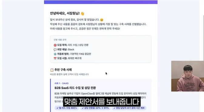 - 맞춤형 제안: 업종, 예산 등에 따라 적절한 레퍼런스 사례를 포함한 이메일을 자동 구성합니다.