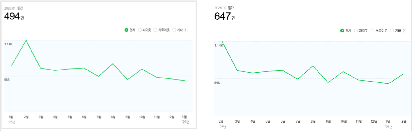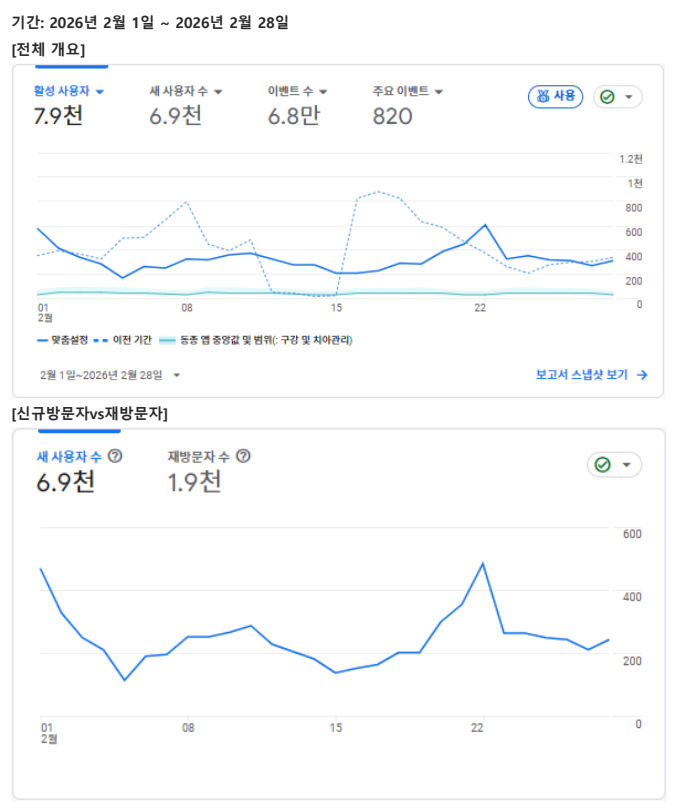 먼저 애널리틱스 데이터를 보면 2월 전체 사용자는 8,703명, 이벤트는 68,476건, 콜 클릭 이벤트는 820건으로 집계되었습니다. 신규 방문자는 6,901명으로 전체의 79.29%를 차지했고, 재방문자는 1,886명이었습니다. 겉으로는 전체 트래픽이 전월 대비 감소한 구간이 있지만, 보고서 코멘트는 이를 단순 악화로 보지 않습니다. 비수기 영향과 1월의 일부 특수효과가 반영된 것으로 해석하면서도, 신규 유입이 여전히 큰 비중을 차지하고 재방문 흐름이 유지된 점을 긍정적 신호로 보고 있습니다.