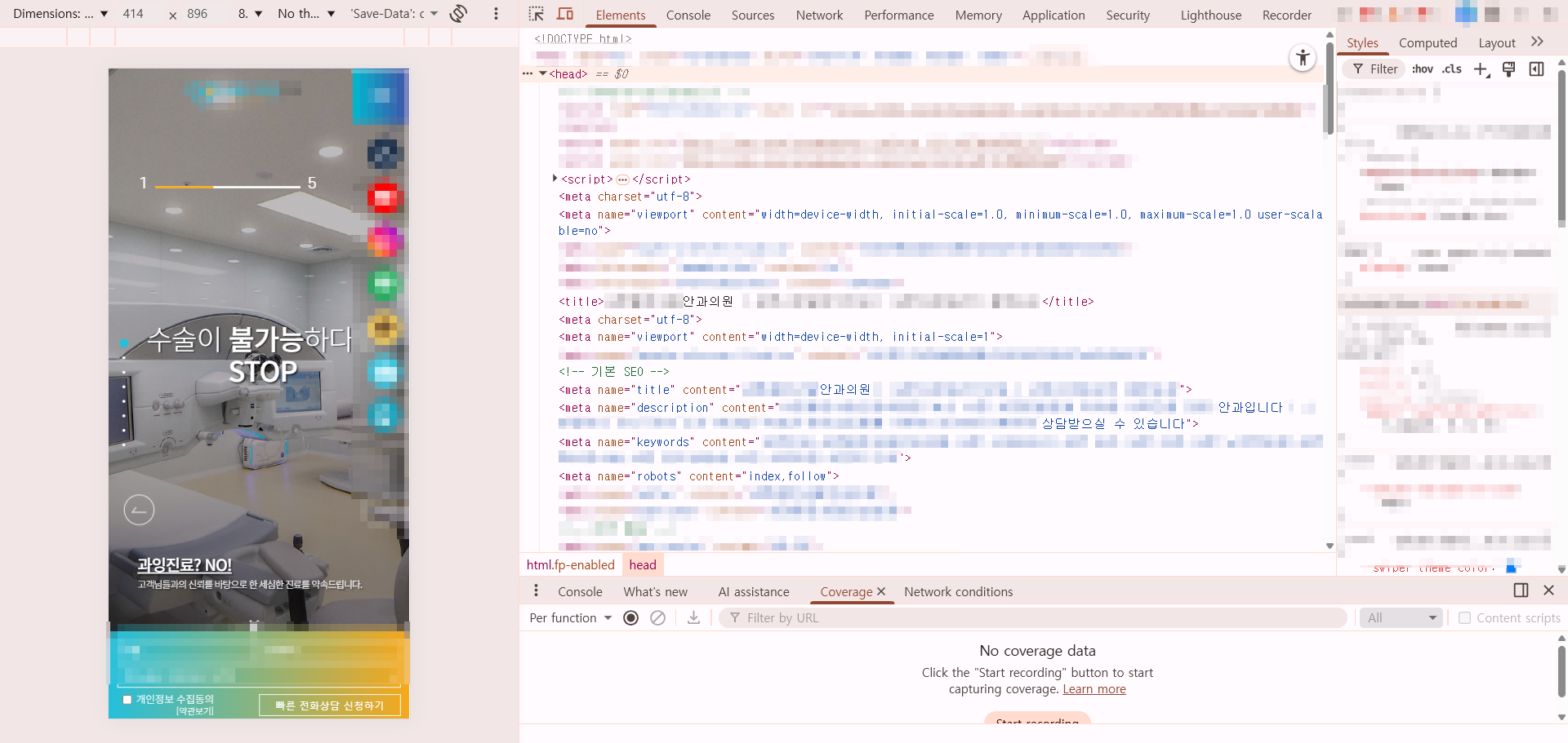 예를 들어 A안과의 경우, 단순히 광고를 운영하는 데 그치지 않고 홈페이지 메인 페이지 구조화 데이터 적용, 주요 페이지 메타 태그 수정, 색인 등록 요청, 분석 도구 연동, UI 보완, 내부 링크 구조 정비 같은 작업이 함께 진행되었습니다.