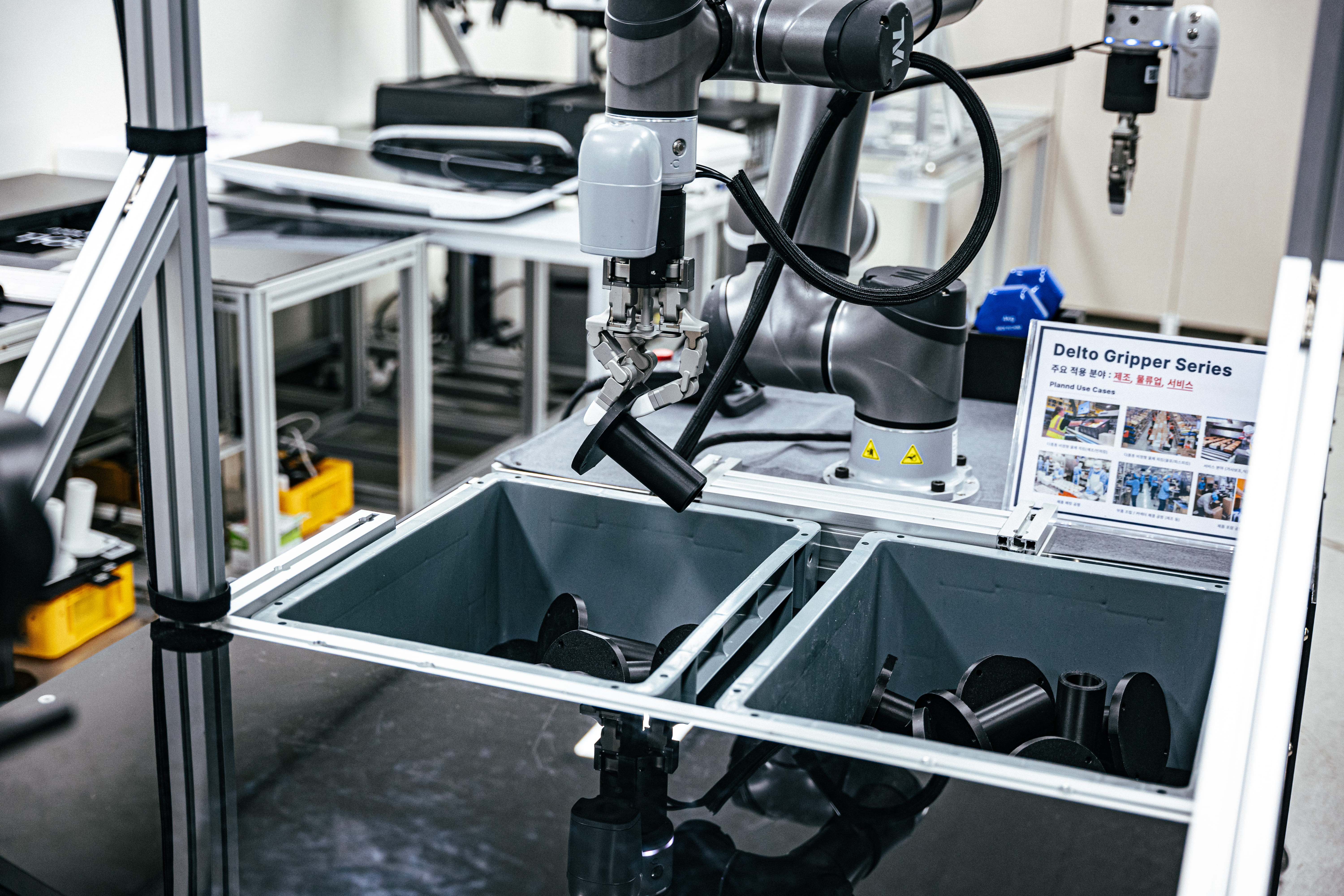 말씀하신 대로 똑같은 물체를 반복해서 옮기는 작업에는 단순한 형태의 그리퍼가 더 적합할 수 있습니다. 하지만 산업 현장은 빠르게 변화하고 있어서 대응이 필요합니다. 고령화의 영향으로 현장 인력 부족 문제가 지속되고 있고, 산업 구조 역시 다품종 소량 생산 체제로 빠르게 변화하고 있습니다. 이러한 환경에서는 다양한 재질과 형상의 물체를 사람의 손처럼 하나의 그리퍼로 유연하게 대응하는 방식이 더 효율적입니다.