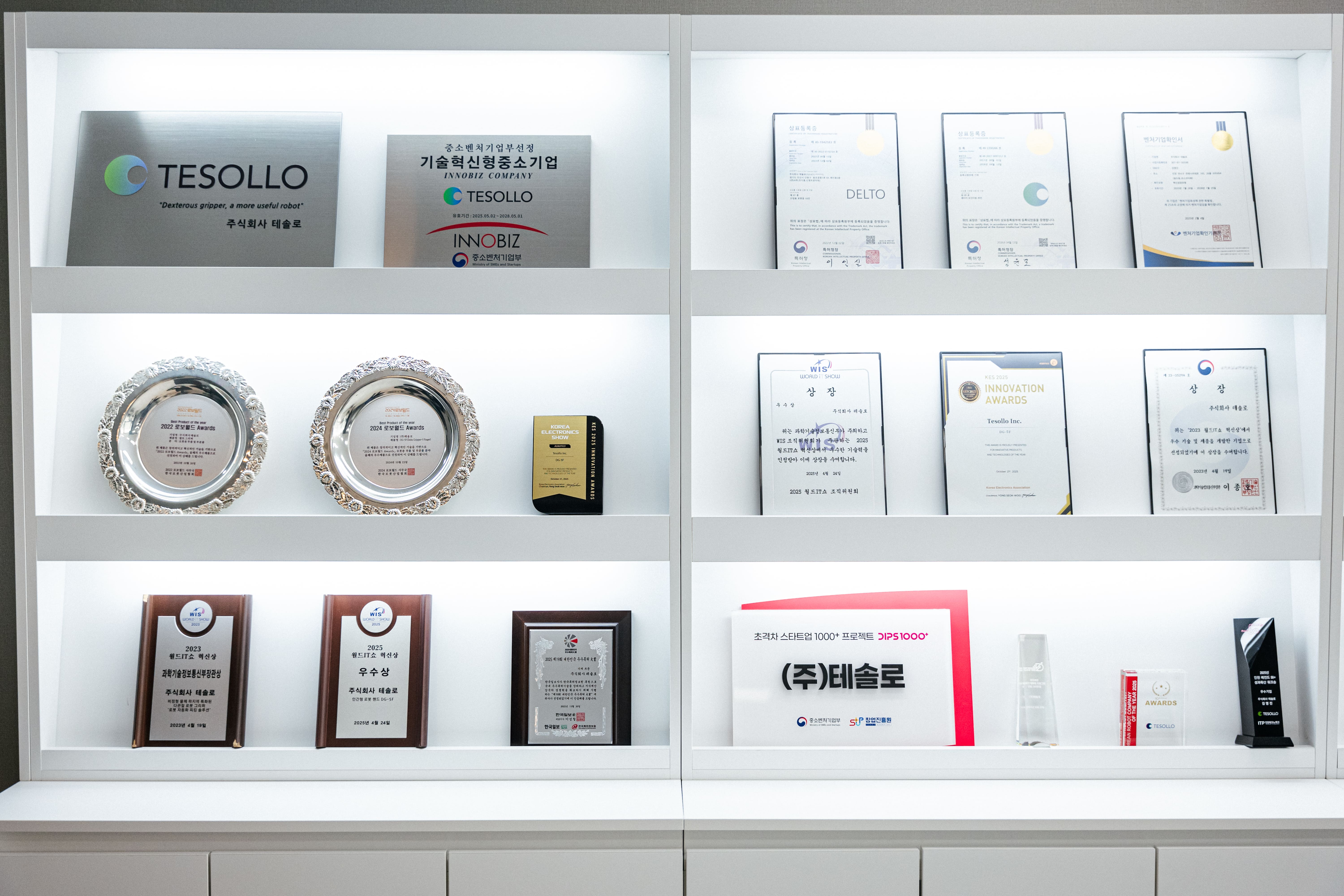 테솔로는 재질과 형상이 다양한 물체를 파지하고 조작할 수 있는 로봇 핸드를 만드는 딥테크 기업입니다. 제품 이름은 ‘델토 그리퍼’로 손가락 1개부터 5개까지 다양한 모델을 구비하고 있고, 대표 제품은 3지 그리퍼와 5지 핸드입니다. 로봇 연구 기관뿐 아니라 제조, 물류, 바이오 등 다양한 산업 현장에 적용 가능하고요. 현재까지 17개국 300개 이상의 고객에게 납품한 실적을 보유하고 있습니다. 기존에 자동화되지 못한 공정까지 저희 제품이 폭넓게 적용되어 ‘제조 생산 라인의 유연화’를 실현하는 것을 목표로 삼고 있습니다.
