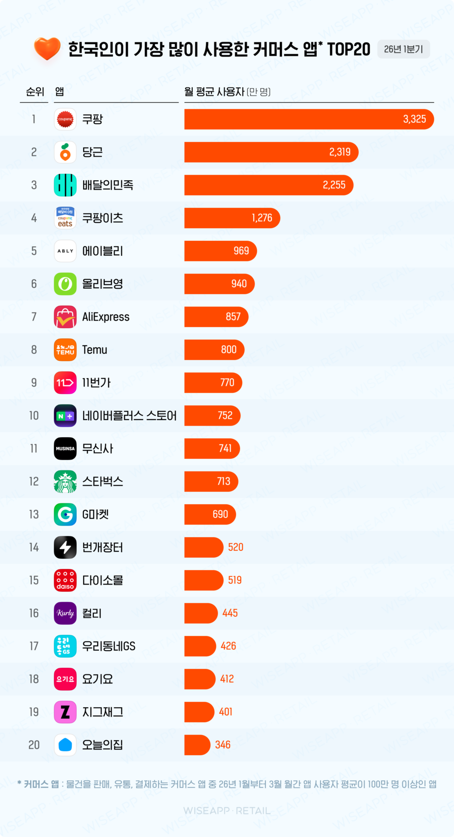 그 뒤를 이어 당근, 배달의민족, 쿠팡이츠, 에이블리, 올리브영, AliExpress, Temu, 11번가, 네이버플러스 스토어, 무신사, 스타벅스, G마켓, 번개장터, 다이소몰, 컬리, 우리동네GS, 요기요, 지그재그, 오늘의집 순으로 나타났어요.