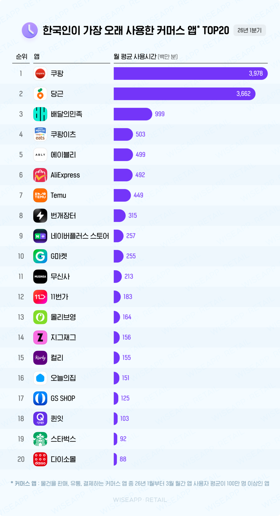 한국인이 가장 오래 사용한 커머스 앱 TOP 3도 쿠팡, 당근, 배달의민족으로 나타났어요. 그 뒤를 이어 쿠팡이츠, 에이블리, 알리익스프레스, 테무, 번개장터, 네이버플러스 스토어, G마켓, 무신사, 11번가, 올리브영, 지그재그, 컬리, 오늘의집, GS SHOP, 퀸잇, 스타벅스, 다이소몰 순이에요.