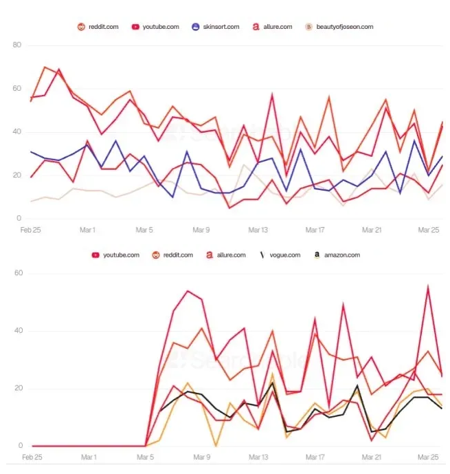 실제 데이터로도 확인이 돼요. 첫 번째 그래프는 K-뷰티 브랜드 조선미녀·메디큐브(글로벌 기준), 두 번째는 동물약품 회사 조에티스 한국 사이트(한국 기준)의 AI 인용 소스를 추적한 자료인데요. 업종도, 지역도 전혀 다른 두 케이스 모두 유튜브가 압도적 1위예요. 어떤 브랜드든 유튜브에 구조화된 콘텐츠가 있으면 AI가 먼저 인용한다는 걸 보여주는 사례입니다!
