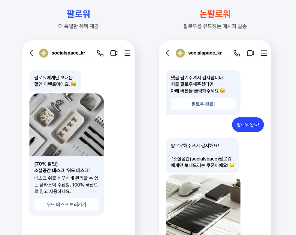 성과가 나는 계정들은 이러한 부분을 다르게 접근해요. 팔로워 구분 발송을 통해 팔로워와 논팔로워의 메시지를 다르게 구성해 정보를 제공하죠. 동일한 콘텐츠에서도 키워드에 따라 메시지 소재를 다르게 설정해서 관심 있어 하는 정보를 유도하고 딱 맞는 메시지로 정보를 확인하게끔 제공해요.