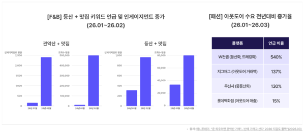 2월 중순부터 관련 언급량이 급증하며 등산은 하나의 아웃도어 트레드로 자리 잡았습니다.