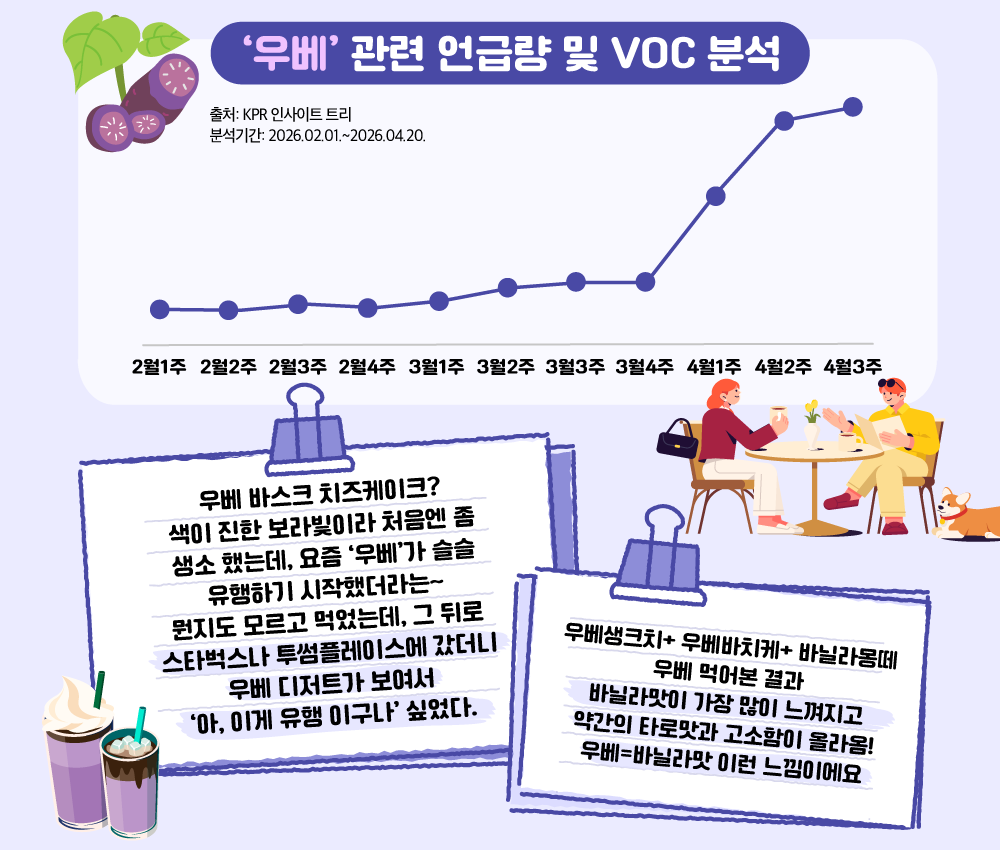 최근 글로벌 유통가와 SNS를 중심으로 ‘우베’ 관련 게시글이 4월에만 약 4,000 건을 돌파하며, 진한 보랏빛이 MZ세대의 ‘인증샷’ 욕구를 자극하는 강력한 트리거로 작용하고 있습니다. 특히 국내에서도 우베를 활용한 비커피 음료가 출시 직후 전체 음료 상위권에 진입하는 등 시각적 요소가 구매 결정의 핵심이 되는 ‘비주얼 소비’ 경향이 뚜렷하게 관찰됩니다. 이는 단순히 맛에 대한 궁금증을 넘어, 인공 색소 없이도 선명한 보라색을 내는 우베 특유의 희소성이 디지털 환경에서 공유하기 좋은 최적의 콘텐츠로 인식되고 있음을 보여줍니다. |
