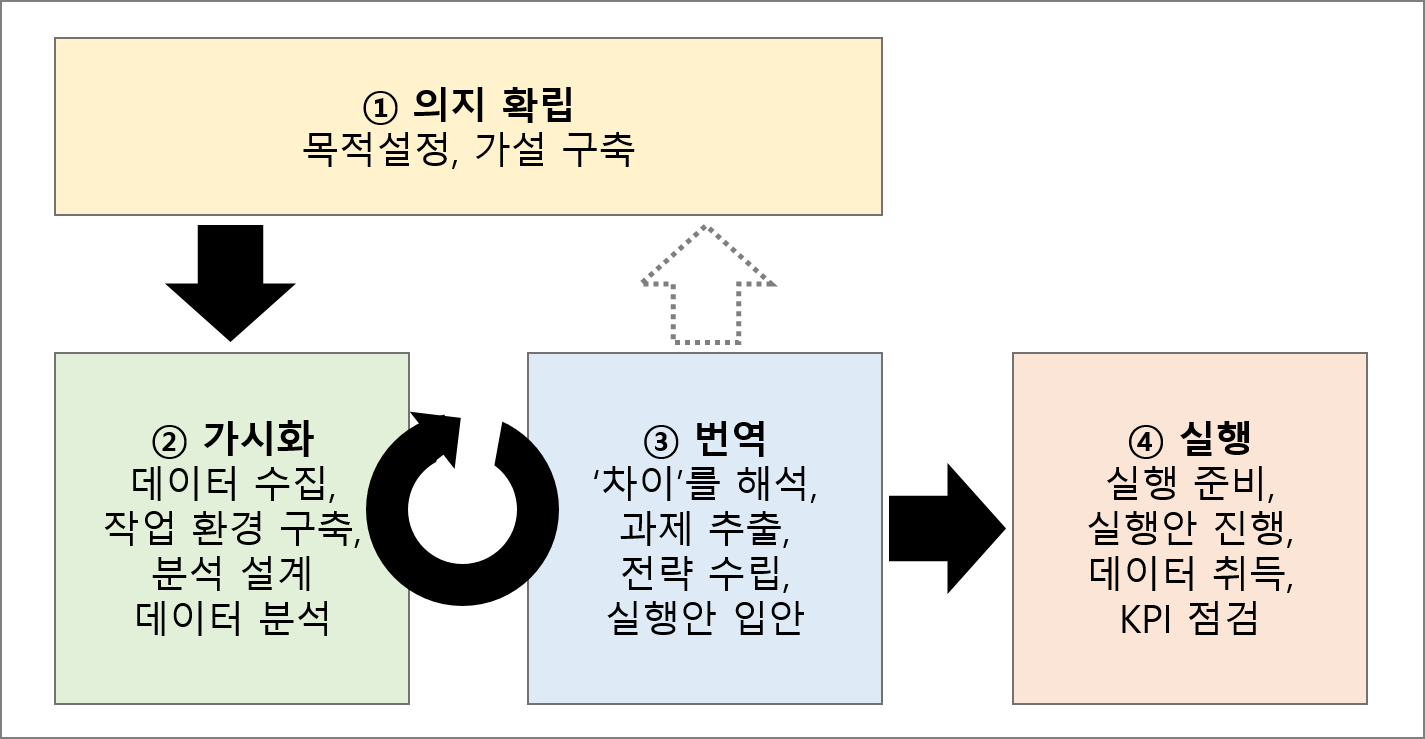 ①데이터 분석에 착수하기 전 분석의 목적을 명확히 하고 가설을 구축하는 ‘의지 확립’ 단계