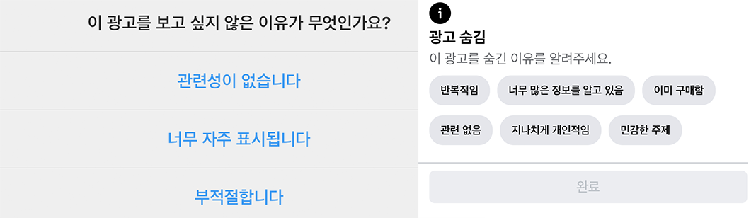 <좌: 인스타그램 / 우: 페이스북 광고 숨김 페이지>