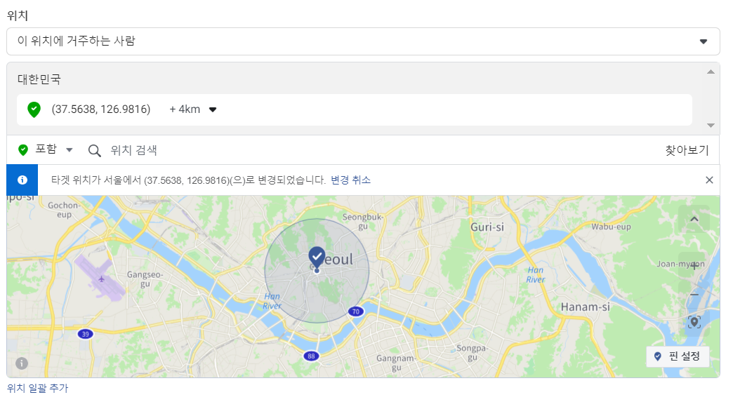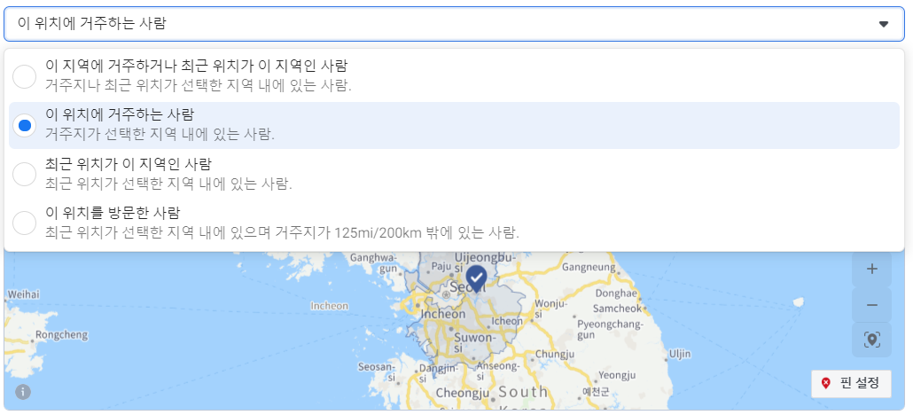 <페이스북 광고 관리자에서 위치 설정하는 화면>