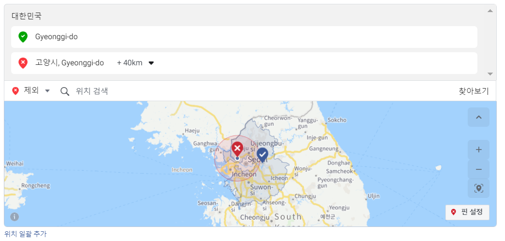제외 지역을 설정하는 것도 가능합니다. 예를 들어, 경기도 전체에 노출을 하면서, '경기도 고양시'를 제외하여 노출하고 싶다면 타겟 지역에 '경기도 부천시', '경기도 용인시', '경기도 화성시', '경기도 시흥시', .... 이렇게 경기도 고양시를 제외한 전체 경기도 내의 시를 입력하는 것 보다 '경기도'를 노출 지역으로 설정한 다음, 제외 지역에서 '경기도 고양시'를 선택하는 것이 더욱 효율적입니다.
