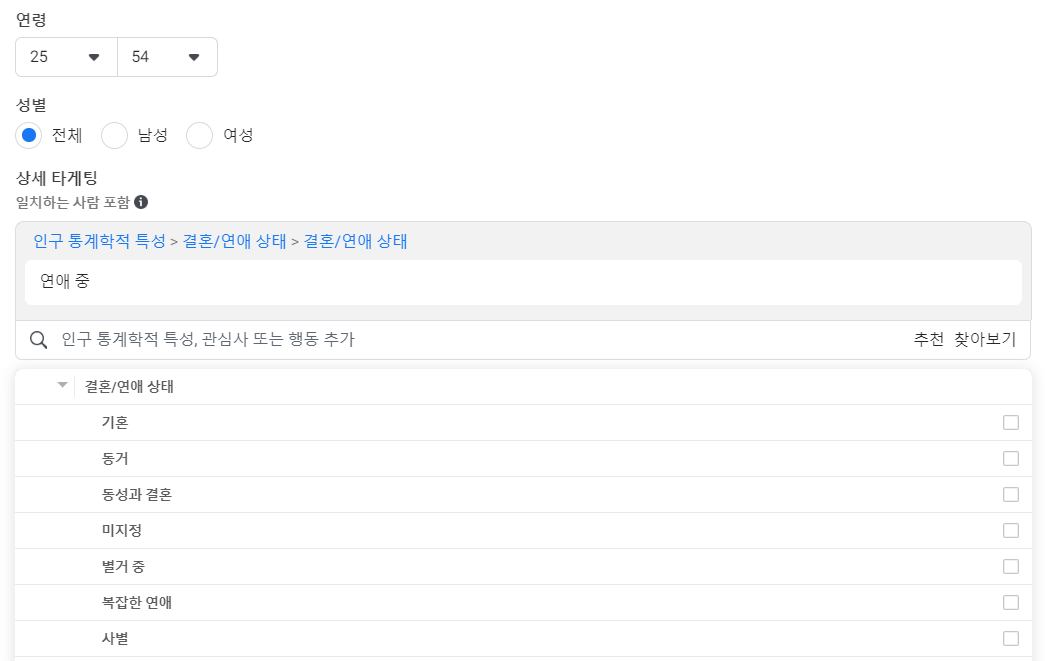 유아를 위한 용품, 사교육, 건강 관련 식품 비즈니스의 경우 부모님을 타겟하는 경우가 많이 때문에 부모 타게팅을 이용하면 효과적입니다. 커플을 대상으로 한 제품이나 결혼을 앞둔 부부를 고객으로 두는 웨딩 업체 등에서는 결혼/연애 상태 타게팅을 특히 유용하게 사용하실 수 있겠죠.
