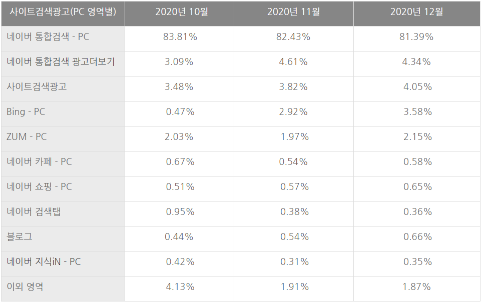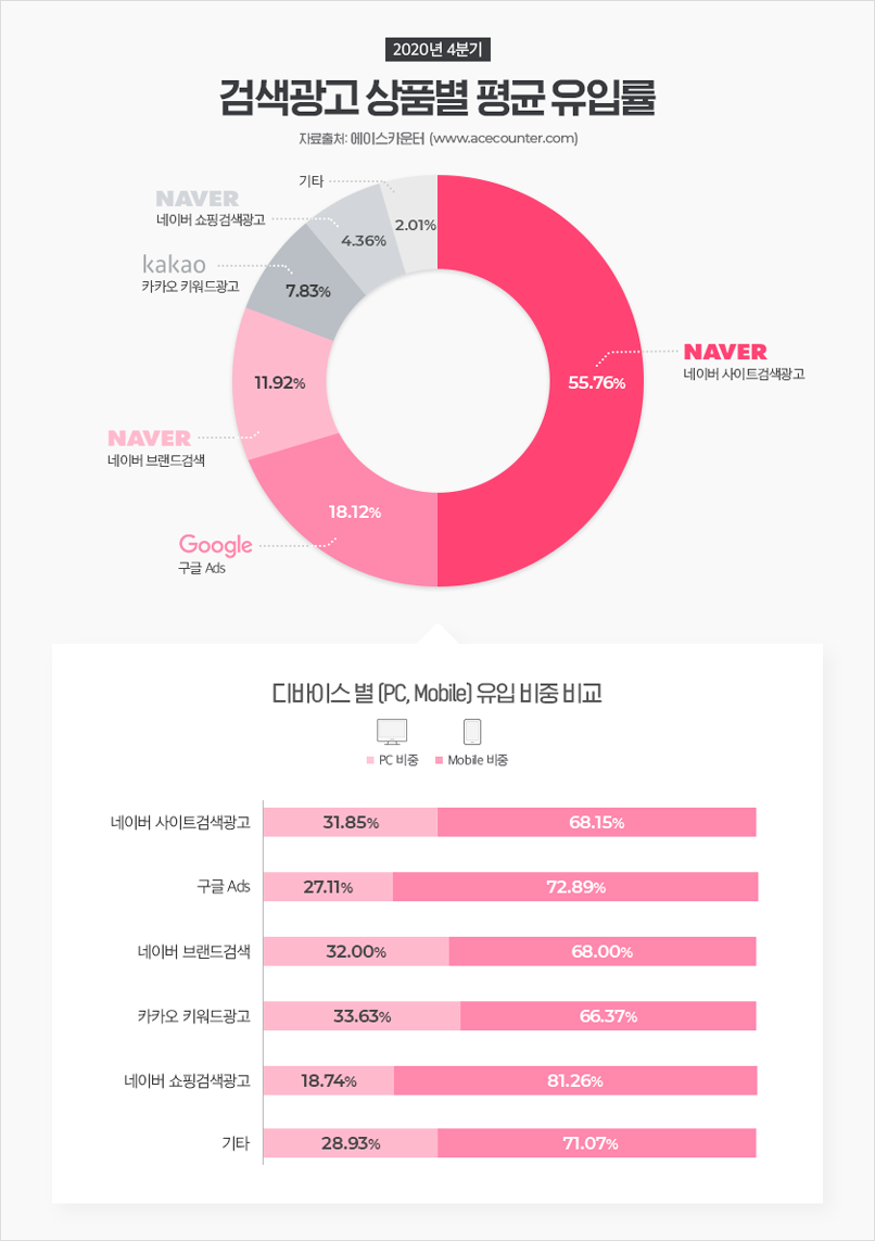 위에는 2020년 4분기 검색광고 상품별 평균 유입률 1위인 '네이버 사이트검색광고'의 광고 노출 영역별 평균 유입률을 PC와 모바일 디바이스로 구분하여 집계한 자료입니다.