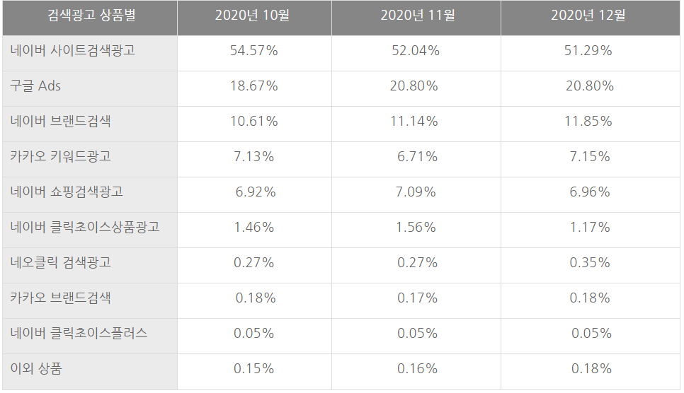 2020년 4분기 검색광고 상품별 평균 유입률 자료를 발표합니다.