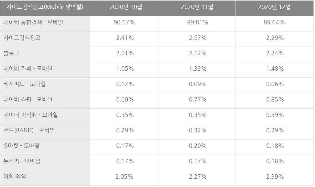 [2020년 4분기 네이버 사이트검색광고 노출 영역별 평균 유입률] - Mobile