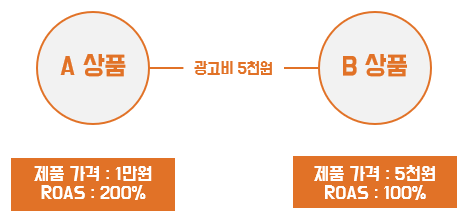 그럼 이 조건에서 매출증대를 위해 주력으로 가져가야 할 제품은 당연 B상품 일 것입니다. 만약 우리의 목표가 ROAS상승이라면 A 상품에 집중해도 되겠죠.
