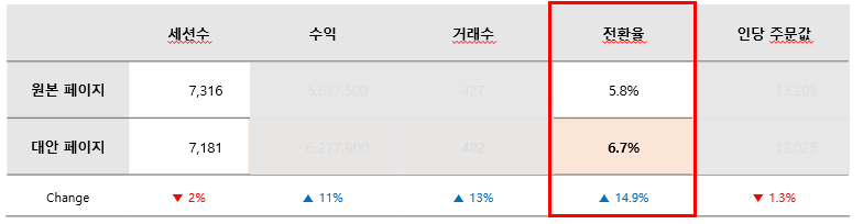 옵티마이즈 툴을 이용하여 A/B테스트를 진행하였습니다. 약 14일간 후기가 상단에 배치되었을 때(대안 페이지)와 원래 위치인 하단(원본 페이지)에 있을 때 전환율을 비교한 결과 후기 상단 배치에서 전환율이 14.9% 높게 나오는 것을 확인하였습니다.
