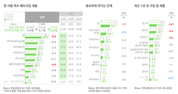 코로나 이후 뷰티 시장 침체가 이어지고 있습니다. 국내 뷰티를 대표하는 아모레퍼시픽도 코로나 여파로 20년 3분기 영업이익이 49%나 감소했죠(기사). 오픈서베이 뷰티 트렌드 리포트 2021를 살펴보면 그중에서도 메이크업 소비 침체가 좀 더 두드러집니다. 2040 여성들의 스킨케어 제품 이용 개수는 감소하지 않았는데(5.0개▶5.1개), 메이크업은 베이스와 색조 모두 이용 개수가 줄었거든요(각 3.1개▶2.9개, 4.1개▶3.9개).