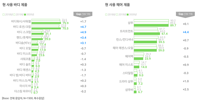 한편, 바디케어는 오히려 전년 대비 사용률이 전반적으로 상승했습니다. 어떤 제품 사용률이 늘었는지 살펴보니, 바디스크럽·바디로션/크림·핸드/풋케어 사용률이 가장 크게 증가했습니다(+4.9%P, +4.7%P, +3.4%P). 헤어 쪽에선 트리트먼트 사용률이 증가했고요(+4.4%P). 코로나 이후 여성 뷰티 시장 전반에 침체가 이어지고 있지만, 깊이 살펴보면 제품 카테고리별 온도 차이가 있는 겁니다. 이에 코로나 상황에도 이용률이 줄지 않거나 오히려 증가하는 제품에 주목하는 것도 좋겠습니다.