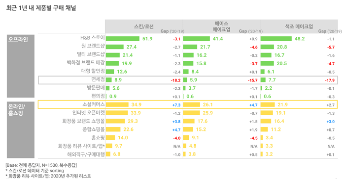 반면, 비대면 방식인 온라인/홈쇼핑 채널은 상황이 조금 다릅니다. 홈쇼핑처럼 1년 내 구매 경험이 하락한 채널도 있지만(각 -4.0%P, -4.5%P, -0.5%P), 쿠팡 등 소셜커머스는 오히려 모든 카테고리에서 1년 내 구매 경험이 상승했습니다(+7.3%P, +4.7%P, +2.7%P). 코로나 이후 여성 뷰티 소비자들이 외출이나 오프라인 매장 방문을 자유롭게 하지 못하게 되자, 온라인 채널을 좀 더 적극적으로 활용하게 된 것으로 보입니다.