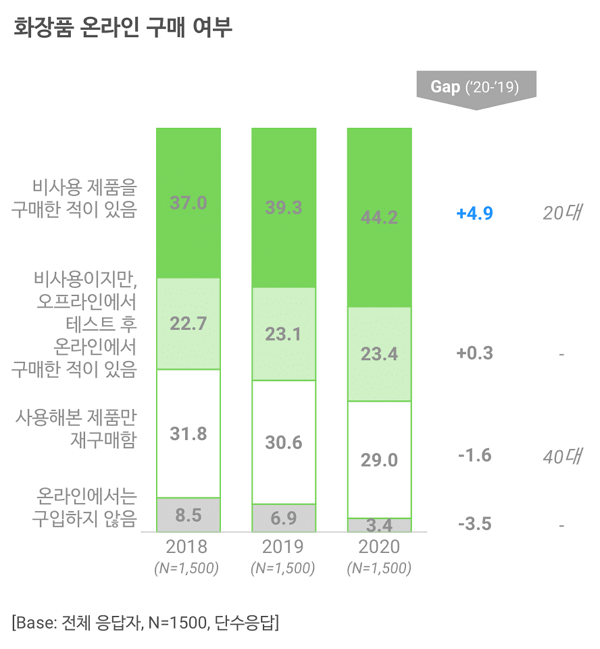 실제로 2040 여성의 화장품 온라인 구매 경험은 지난 3년간 꾸준히 증가하고 있습니다. 이중 사용해본 적 없는 뷰티 제품에 대한 구매 경험의 증가 폭이 가장 큽니다(37.0%▶39.3%▶44.2%). 이제는 사용 경험이 없고 구매 전 오프라인에서 테스트를 해보지 않고도 온라인에서 구매한다는 비율이 2040 여성 뷰티 소비자의 절반에 육박할 정도로 많아진 겁니다. 이에 코로나 종식 이후에도 온라인 채널 성장은 계속될 것으로 보입니다.