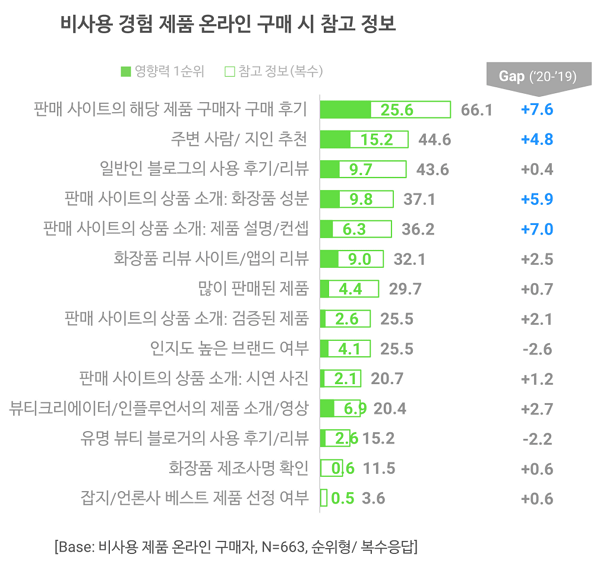 그럼 사용 경험이 없는 뷰티 제품을 구매할 때는 어떤 정보를 참고하고 있을까요? 가장 많이 참고하는 정보는 판매 사이트에 있는 구매 후기입니다(66.1%). 주변 지인의 추천이나 일반인 블로그의 리뷰에도 많은 영향을 받는 편이고요(각 44.6%, 43.6%). 또한, 화장품 성분이나 제품 설명 등 판매 사이트의 상품 소개 정보를 참고한다는 의견 역시 전년 대비 많이 늘었습니다(각 +5.9%P, +7.0%P). 온라인을 통한 뷰티 제품 구매가 활성화될수록 온라인 판매 사이트의 역할은 더욱 중요해지지 않을까 싶습니다.