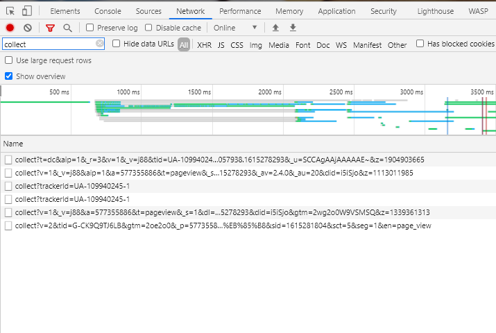 GA와 Facebook은 API를 이용하여 데이터를 전달합니다. 그렇기 때문에 Network에서 데이터를 확인할 수 있습니다.