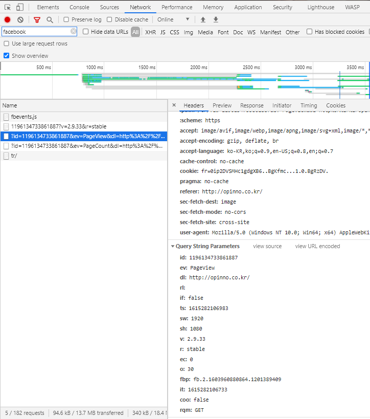 [사진 5. Facebook으로 전달되는 데이터(pageview)]