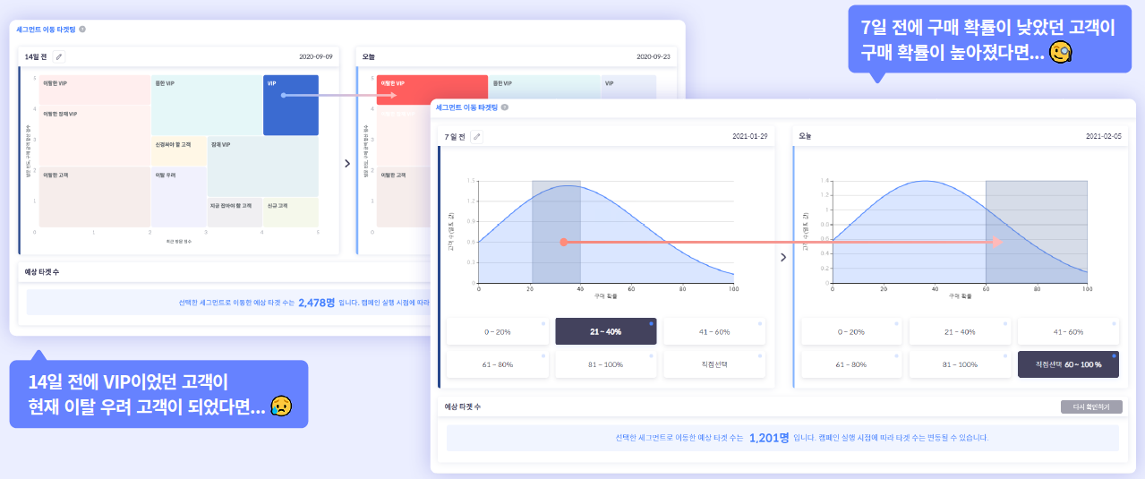 아울러 다양한 고객 행동 데이터를 바탕으로 구매 확률을 예측해 확률 구간별로 고객을 세분화해 마케팅 실행이 가능하다. 고객 속성, 행동 관련 40가지 행동 변수를 적용해 구매 전환 상승을 위한 타겟팅으로 캠페인 진행이 가능하다. 예를 들어 2주 전에는 구매 확률이 60~80%로 높았지만 10~30%로 떨어진 고객들을 찾아내 이 고객들의 구매 의욕을 높일 수 있는 마케팅 메시지를 푸시 알림으로 전달하는 등의 전략이 가능해진다.