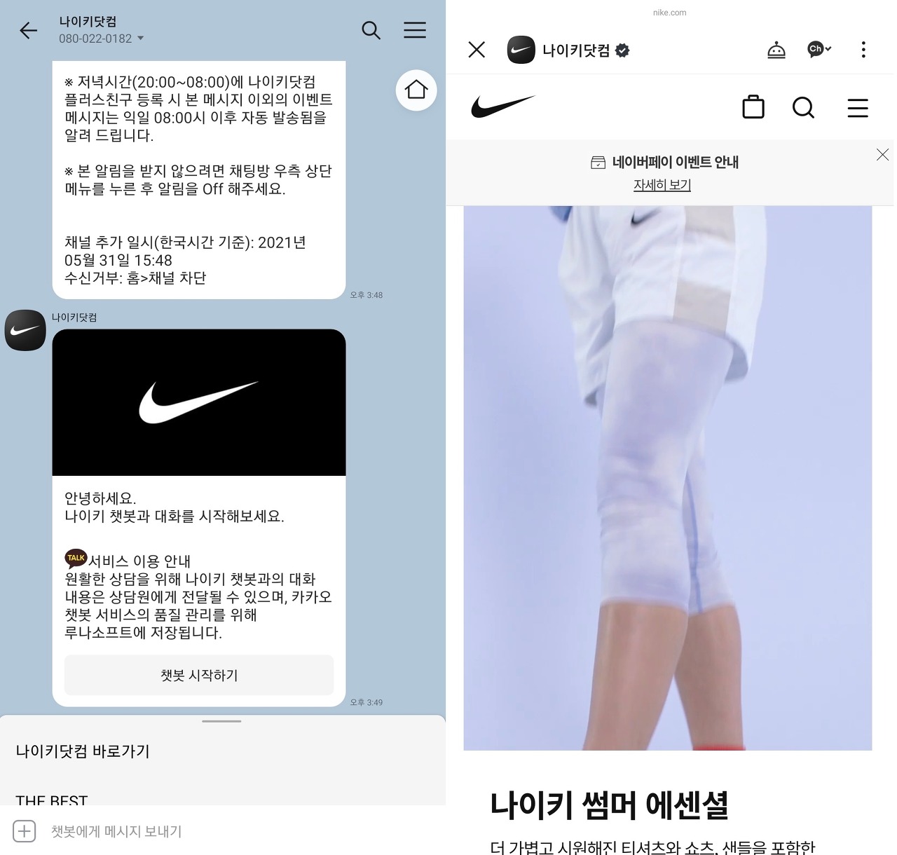 카카오점은 나이키의 쇼핑몰을 그대로 미러링한 걸로 보입니다 (출처: 나이키 카카오톡 채널)