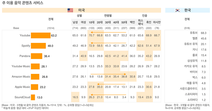 연령별 편차도 있습니다. 유튜브는 연령대가 낮을수록 이용률이 높긴 해도 편차가 적은데, 스포티파이는 10대와 50대 이용률 차이가 3배 가까이 될 정도로 연령별 이용률 차이가 큰 편입니다(각 72.9%, 28.7%). 반면, 판도라는 30~50대 이용률이 가장 높죠(각 42.5%, 41.2%, 41.4%). 기본 유료 음악 서비스 중에서도 아마존 뮤직은 연령대가 높을수록, 애플뮤직은 낮을수록 이용률이 높습니다. 이렇게 미국 음악 서비스는 이용층이 다양하게 형성되어 있다는 점은 기억해두면 좋겠습니다.