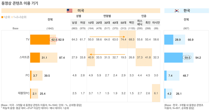 다음은 동영상 콘텐츠 이용 현황입니다. 미국은 여전히 주로 TV를 통해 동영상 콘텐츠를 봅니다. 주로 동영상을 보는 기기 1순위로 TV를 꼽은 비율이 무려 62.9%에 달한 겁니다. 스마트폰으로 패러다임이 완전히 전환된 한국과는 다른 모습입니다(59.5%). 물론, 미국 역시 연령대가 낮을수록 주로 스마트폰으로 동영상을 보는 비율이 높습니다. 이에 머지않아 미국 동영상 콘텐츠 기기 시장도 지금의 한국과 유사하게 변화하지 않을까 추측해볼 수 있습니다.