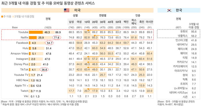 이는 한국과는 사뭇 다른 모습입니다. 한국은 유튜브·넷플릭스·인스타그램 이외에는 최근 3개월 내 이용 경험이 30%를 넘는 서비스가 없습니다. 주요 로컬 OTT 서비스인 웨이브와 티빙 이용 경험도 각 16.8%, 14.9%에 불과하죠. 글로벌 서비스인 유튜브·넷플릭스·인스타그램 이외에는 최근 이용 경험 자체가 매우 적은 한국 동영상 서비스 시장과 달리, 미국은 유튜브와 넷플릭스를 주로 보더라도 다양한 동영상 서비스를 함께 이용한다는 점이 흥미롭습니다.