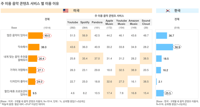 먼저 한국 소비자는 주 이용 음악 서비스를 쓰는 가장 큰 이유로 ‘익숙해서’를 꼽습니다(56.9%). 많은 음악이 있어서, 내게 맞는 음악을 잘 추천해줘서, 디자인이 좋아서 등 기능적인 부분은 익숙함 대비 덜 중요한 요인으로 여겨집니다(각 36.7%, 18.5%, 2.1%). 아직 기능성이 시장을 리드하는 차별화 요소로 작용한다기보다는 관성적인 이용 패턴이 좀 더 관찰되는 겁니다. 이외에 할인/제휴 프로모션이 있어서라는 의견도 미국 결과와 비교하면 상당히 높다는 점도 흥미롭습니다(각 25.5%, 9.5%).