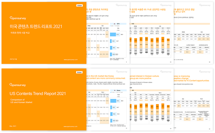 <오픈서베이 미국 콘텐츠 트렌드 리포트>는 미국 소비자의 콘텐츠 서비스에 월평균 지출 비용, 케이팝·케이드라마 등 K-콘텐츠 소비 행태, 한국산 제품 구매 경험 및 향후 구매 의향 등에 대해서도 다루고 있으며, 해외 지사나 파트너사에 공유할 수 있도록 영문 버전도 함께 제공하고 있습니다. 전체 내용이 궁금하신 분은 아래 ‘미국 콘텐츠 트렌드 리포트’ 버튼을 눌러 리포트 전문을 확인해보세요.