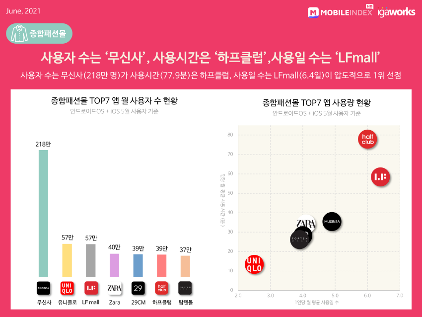 5. 사용자 수는 '무신사', 사용시간은 '하프클럽', 사용일 수는 'LFmall'