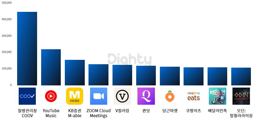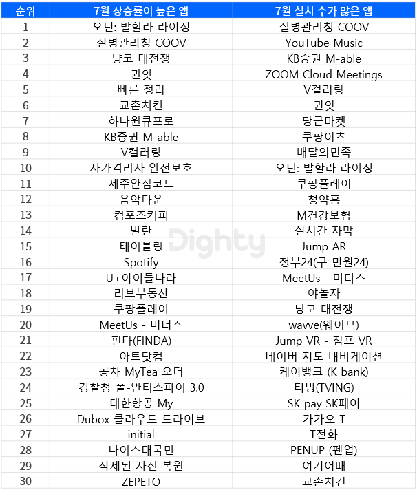 또한 7월은 코로나 확진자 수가 역대 최고를 경신한 달로, 재택근무와 배달주문이 늘며 비대면 관련 앱인 ZOOM, 쿠팡이츠, 배달의 민족 앱들이 10위권에 올랐습니다.