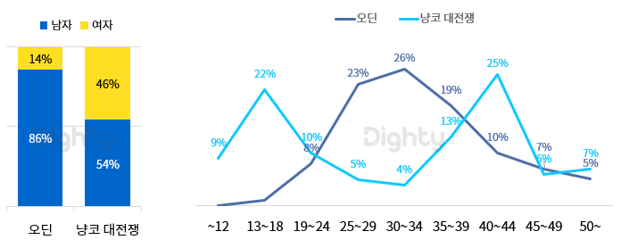 또한 청소년 이용 불가 등급인 오딘은 설치자의 절반인 49%가 25~34세로 확인되었으나, 냥코 대전쟁의 25~34세 비중은 단 9%였습니다. 냥코 대전쟁의 설치자는 청소년(13~18세)과 청소년 부모 연령대(35~44세)가 가장 많은 것으로 나타났습니다.