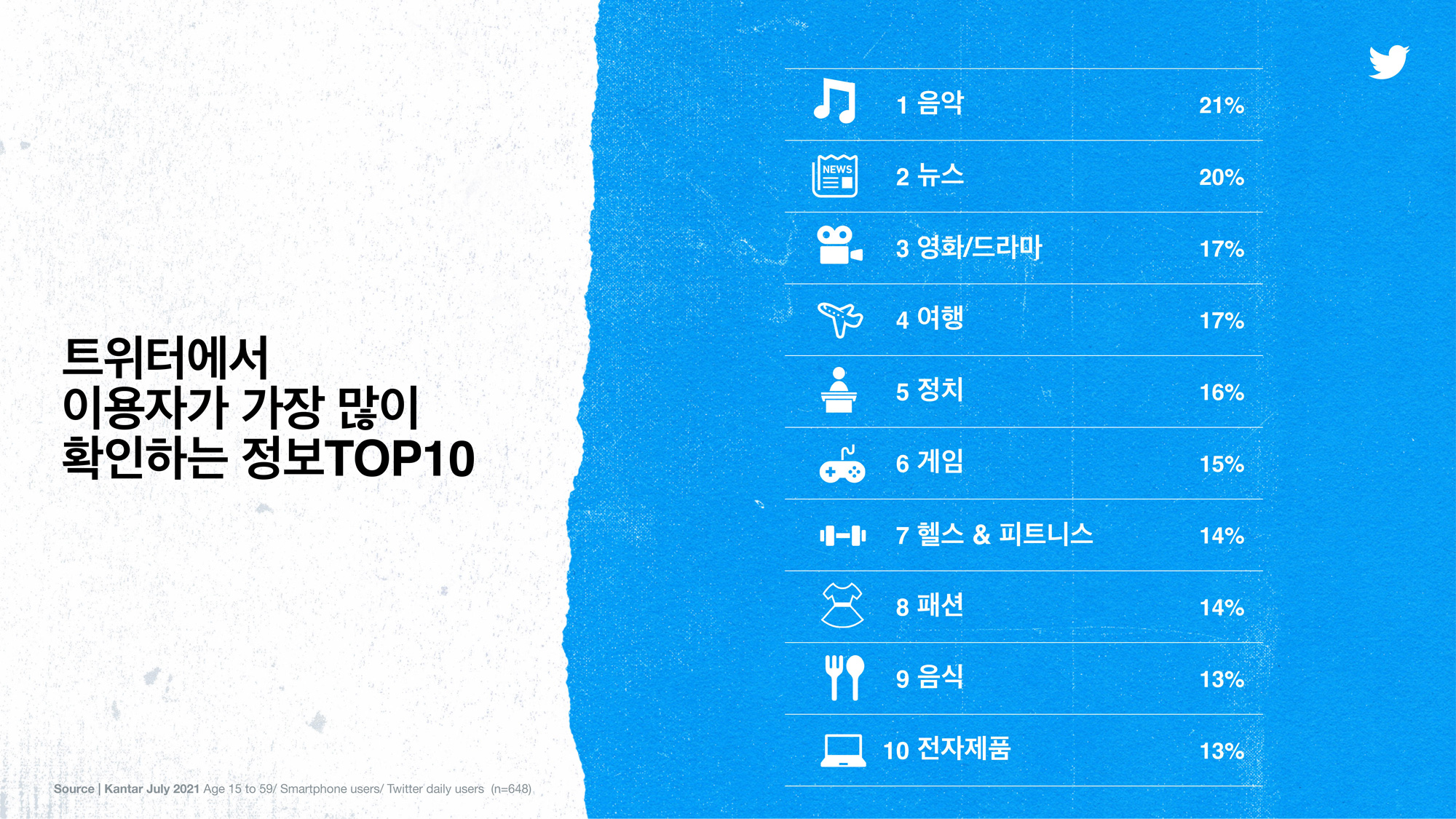 트위터에서 이용자가 가장 많이 확인하는 정보는 ‘음악(21%)’로 집계됐다. 이외에도 뉴스(20%), 영화/드라마(17%), 여행(17%), 정치(16%), 게임(15%), 헬스&피트니스(14%), 패션(14%), 음식(13%), 전자제품(13%) 등 다양한 카테고리의 정보를 트위터를 통해 확인하고 있었다.
