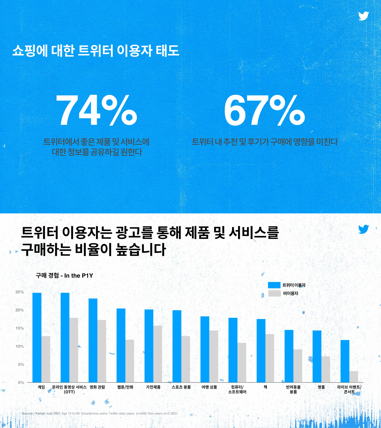 트위터 이용자는 광고를 통해 제품 및 서비스를 구매하는 비율도 높은 것으로 확인됐다. 조사에 따르면 트위터 이용자는 게임, 온라인 동영상 서비스(OTT), 영화 관람, 웹툰/만화, 가전제품, 스포츠 용품, 여행 상품, 컴퓨터/소프트웨어, 책, 반려동물 용품, 명품, 라이브 이벤트/콘서트 등의 카테고리에서 트위터 비이용자 대비 광고를 통한 구매율이 높은 것으로 나타났다. 또한 61%에 달하는 이용자가 광고를 통해 기업 및 브랜드에 대해 친밀함을 느낀다고 답했다.