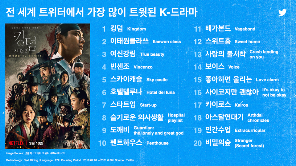 ‘전 세계 트위터에서 가장 많이 트윗된 K-드라마’ 순위에는 ‘킹덤’이 1위, 원작 웹툰에 기반한 ‘이태원 클라쓰’가 2위, 아스트로의 차은우의 출연이 관심을 모았던 ‘여신강림’이 3위, 배우 송중기와 2PM의 옥택연이 출연한 ‘빈센조’가 4위를 차지했다. 이외에도 ‘SKY 캐슬’, ‘호텔 델루나’, ‘스타트업’, ‘슬기로운 의사생활’, ‘도깨비’, ‘펜트하우스’, ‘사랑의 불시착’, ‘사이코지만 괜찮아’, ‘카이로스’, ‘비밀의 숲’ 등의 드라마가 TOP20에 이름을 올렸다.