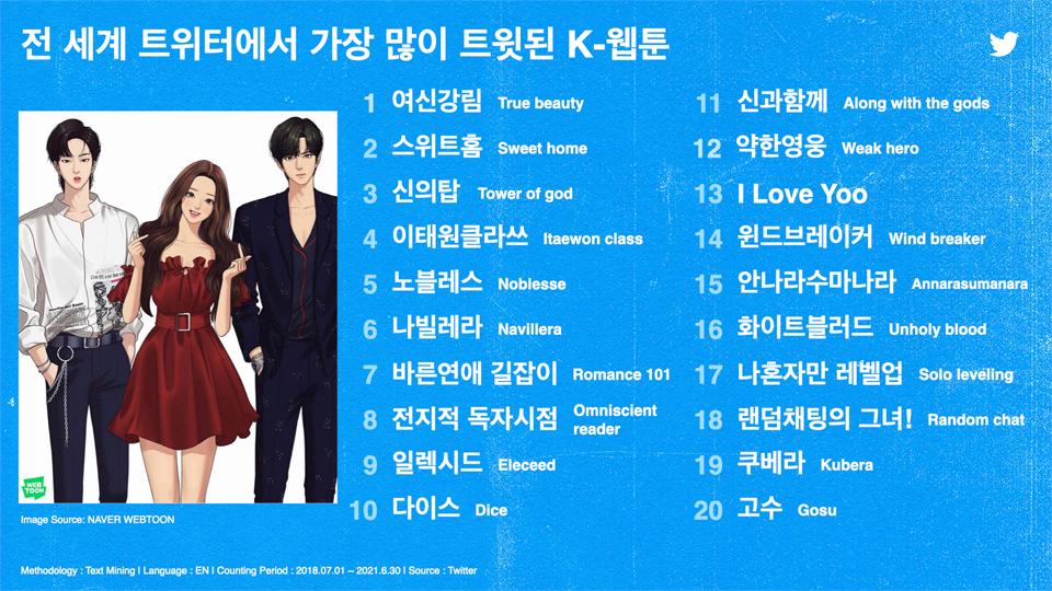 K-POP으로 시작된 K-드라마의 인기는 자연스럽게 원작 웹툰에 대한 관심으로도 이어지고 있다. ‘전 세계 트위터에서 가장 많이 트윗된 K-웹툰’ 1위는 드라마 순위 3위에도 올랐던 ‘여신강림’이었으며, 넷플릭스 오리지널 시리즈로 제작된 ‘스위트홈’이 2위, 글로벌 누적 조회 수 45억 뷰를 돌파한 ‘신의 탑’ 이 3위, ‘이태원클라쓰’, ‘노블레스’가 각각 4위, 5위에 올랐다. 6위에 오른 ‘나빌레라’는 방탄소년단의 뷔가 팬카페에 추천하면서 화제를 모은 바 있다. 지난 3년간 ‘전 세계 트위터에서 가장 많이 트윗된 K-웹툰’ TOP10 중 4개의 웹툰이 드라마로 제작되어 팬덤을 확장시킨 것으로 확인됐다.