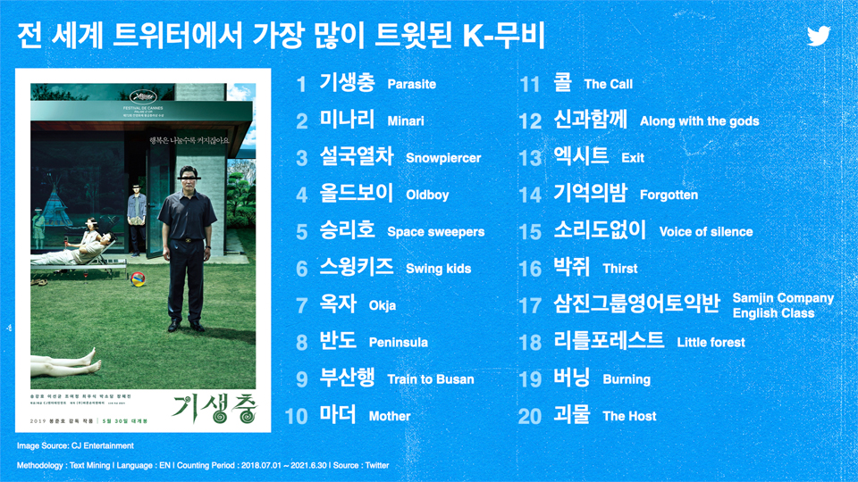 ‘전 세계 트위터에서 가장 많이 트윗된 K-무비’에는 봉준호 감독의 ‘기생충’이 1위로 집계됐으며, 윤여정 배우에게 아카데미 여우조연상을 안겨준 영화 ‘미나리’가 2위에 올랐다. 봉준호 감독의 ‘설국열차’, ‘옥자’, ‘마더’, ‘괴물’과 박찬욱 감독의 ‘올드보이’, ‘박쥐’, 연상호 감독의 ‘반도’, ‘부산행’을 포함해 ‘승리호’, ‘스윙키즈’, ‘콜’, ‘신과함께', ‘엑시트’, ‘소리도 없이’, ‘삼진그룹 영어토익반’ 등 다양한 장르의 영화가 TOP20으로 확인됐다.