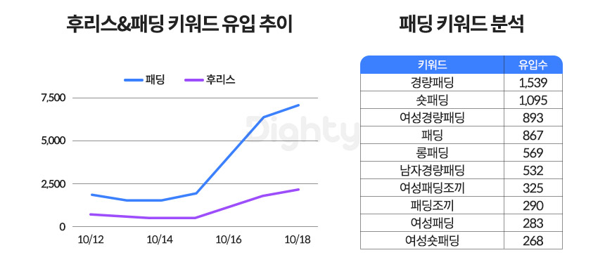 대표적인 겨울 패션 아이템인 후리스와 패딩 키워드 모두 기온이 갑자기 떨어진 10월 16일부터 크게 유입량이 증가했습니다. 두 키워드를 비교했을 때에는 패딩 키워드가 3~4배 많았는데, 10월 키워드로 살펴본 패딩의 트렌드는 '경량 > 숏 > 롱 > 조끼' 로, 롱패딩보다는 숏 패딩의 탐색이 많았습니다. 11월, 12월까지 숏이 롱을 이길지 업종별 키워드 데이터를 월 단위로 확인할 수 있습니다.