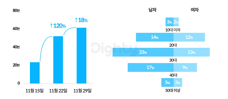 11월 12일 출시된 디즈니+앱은 11월 15일 기준으로 약 24만명의 신규 설치자가 생겼고, 1주 후에는 약 52만 명으로 전주 대비 무려 120% 성장을 보였어요. 이는 '마블민국'을 만드는 데 진심인 3040 남성 유저의 많은 설치가 큰 힘이 되었어요. 실제로 디즈니+의 전체 가입자 중 40%는 3040 남성층이 차지할 정도로 그 비중이 높았습니다.