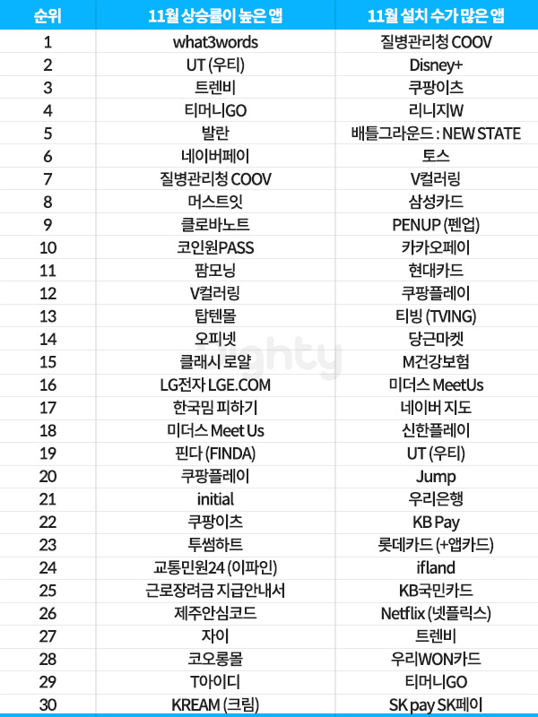 - 2021년 11월, 설치수 상승률 높은 앱 & 설치 수 높은 앱 TOP 30 -