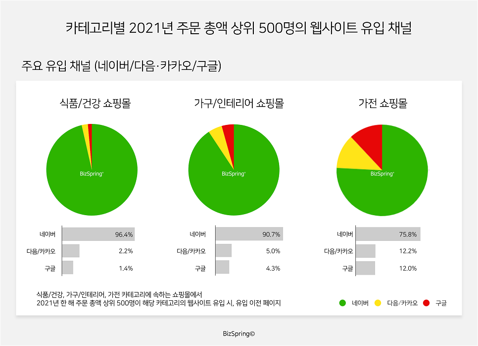 카테고리별 2021 주문 총액 상위 500명의 쇼핑몰 유입경로 #식품/건강 #가구 #가전
