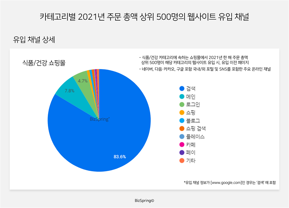 식품/건강 쇼핑몰은 [검색]이 80% 이상으로 매우 높았습니다. [검색]을 통한 유입이 높은 것으로 보아, 방문자가 찾고자 하는 ‘무엇’이 매우 명확한 경향이 있는 것으로 해석할 수 있습니다.
